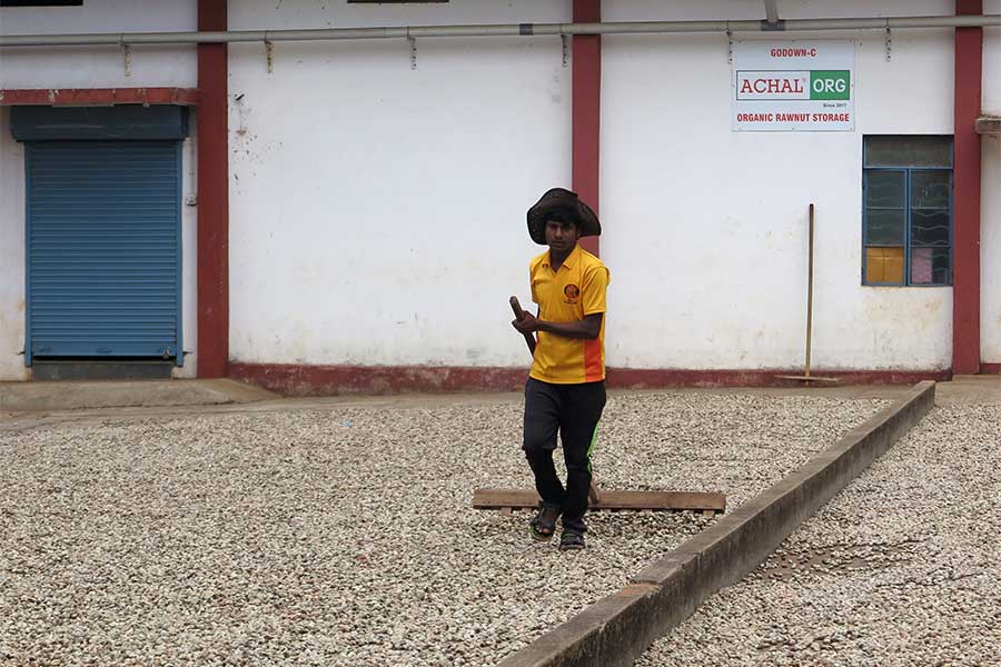 "My job at Achal is peeling the organic cashew kernels. I enjoy working here, because the company provides a safe job for me", confirms Padmavathi. She is one of nearly 800 fully employed staff in the family-run processing company. Achal buys best-quality cashew nuts from approximately 6,000 organic peasants and takes its responsibility for the supply chain very seriously.