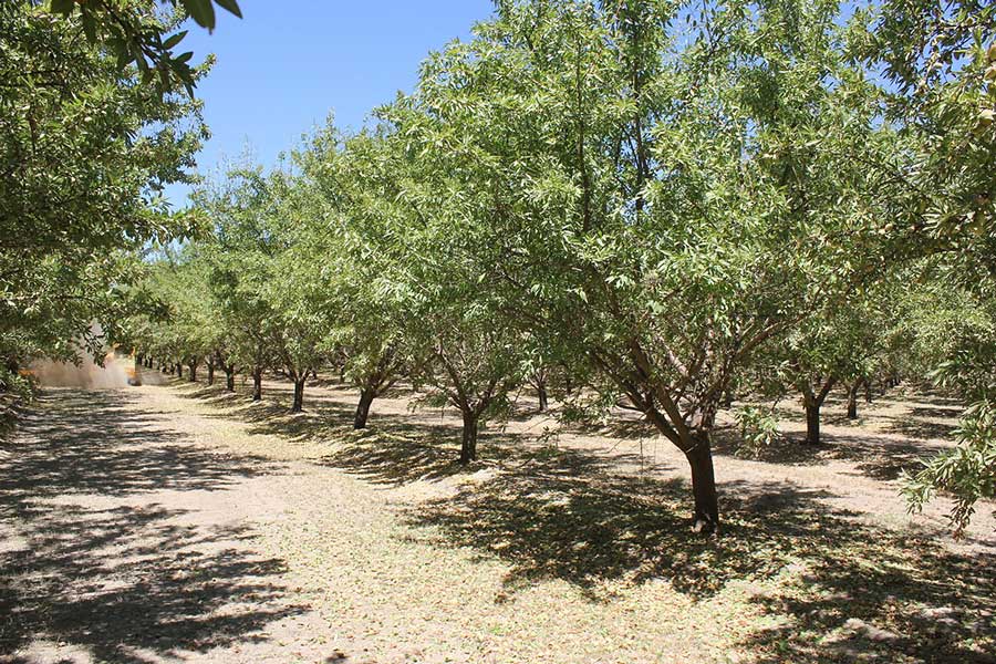 Depending on the almond variety, the trees are harvested from the end of August until October. The fruit are shaken from the trees by machine and are left on the ground for drying. After about one week, they are picked up from the ground and soil, leaves and twigs are removed.