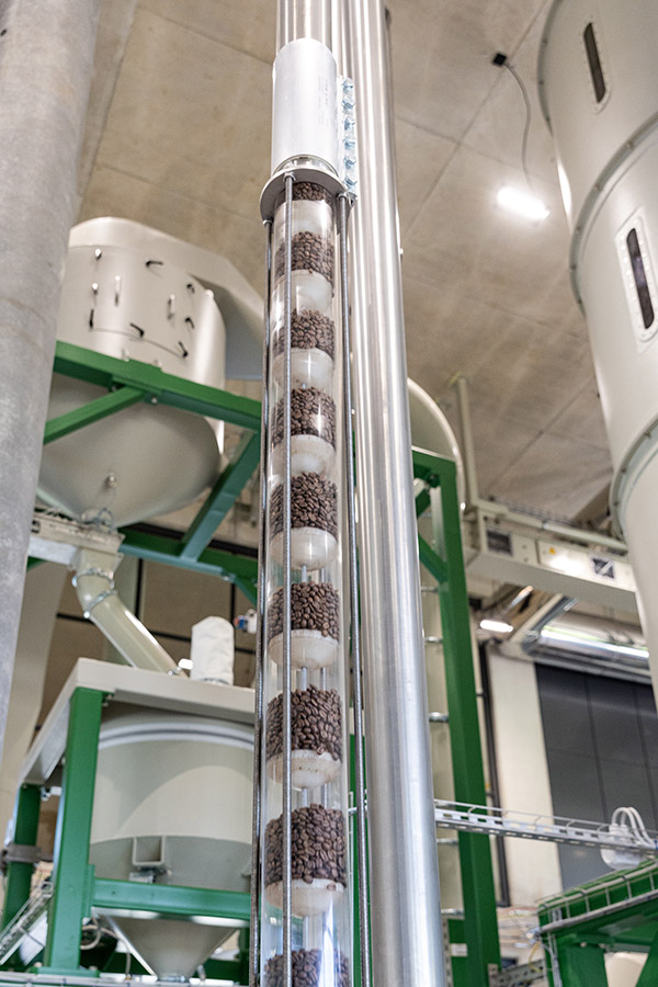 The roasted coffee beans are very light because the roasting process opens up the beans’ pores, allowing the residual water to escape. The sensitive beans are sucked up by an air stream and transported to a storage container. From here they are taken in small quantities by hand in small carriages to the grinder or packaging machine.
