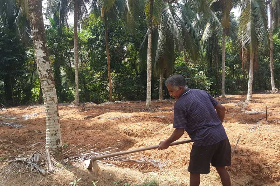 In addition to drainage, the maintenance measures also include regular mulching and weeding. Coconut shells and fibres protect the soil in the hot, dry seasons and, at the same time, together with cow dung and compost, serve as biological fertiliser. Mixed crops with banana, pepper, pulses, grassland or cereals are common, and EAOS wants to further promote biodiversity with the farming families.