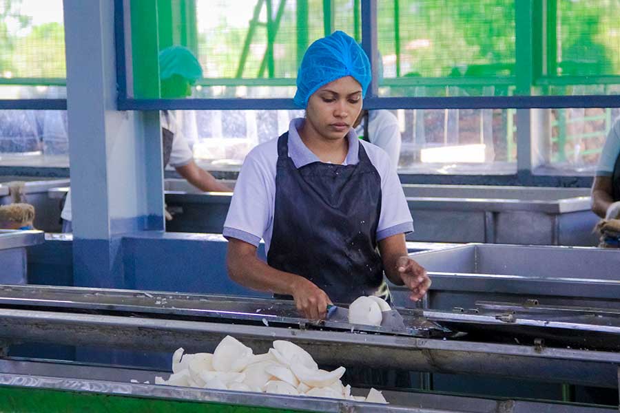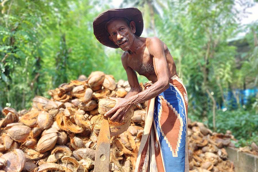 EOAS processes the coconuts. The fruits are crushed after peeling and skinning.