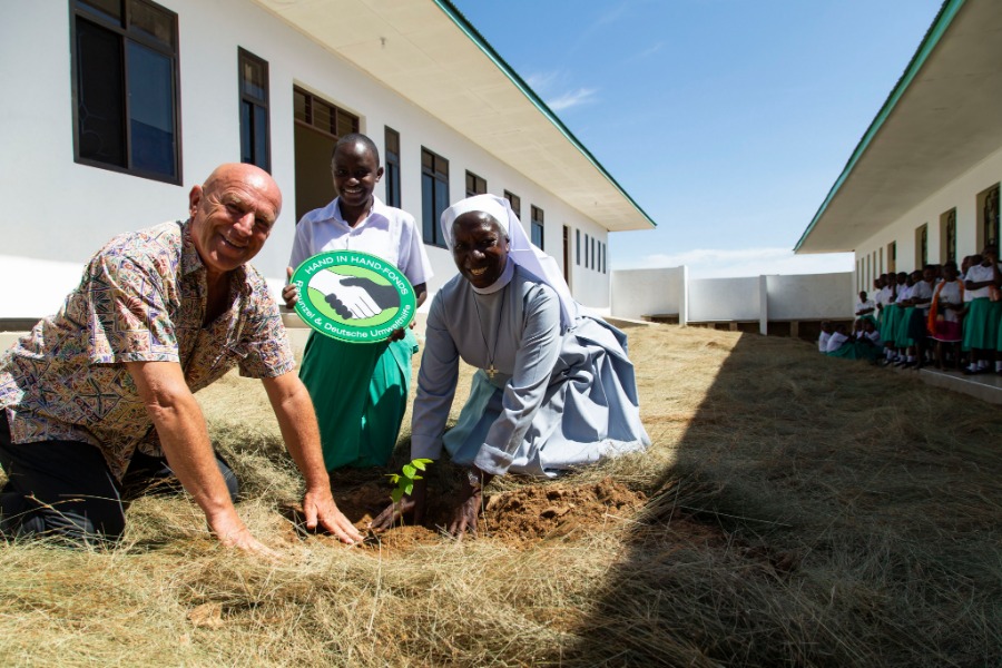 Joseph Wilhelm, founder and shareholder of Rapunzel, plants a tree at the opening of a dormitory at Hekima Girls’ Secondary School in Tanzania.