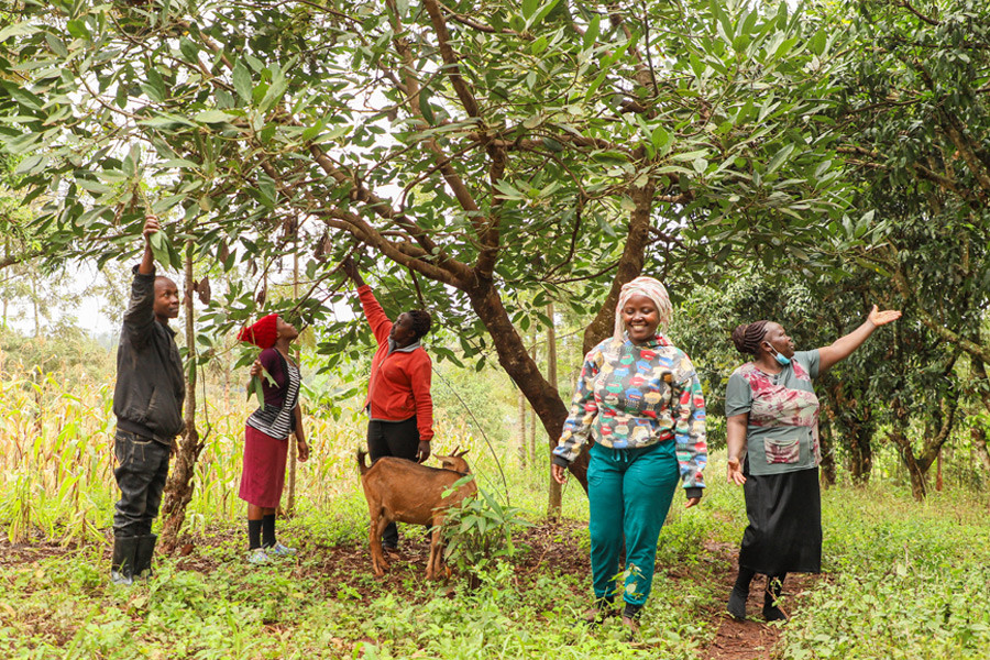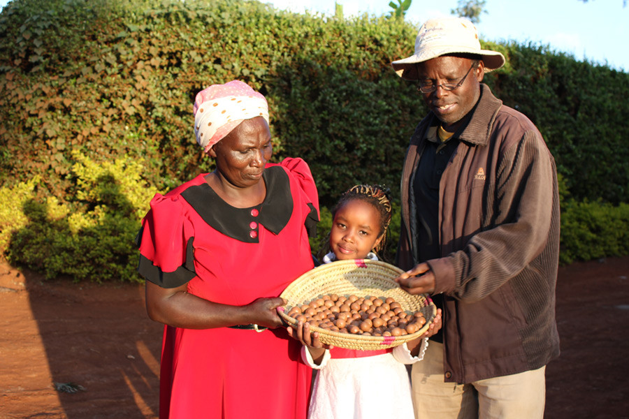 Farmer, Esther Njoki (l.), and her family proudly present a basket of their macadamia harvest.