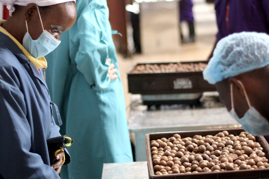 Qualitätskontrolle: Die geknackten Macadamia-Nüsse werden bei LIMBUA sorgfältig geprüft.