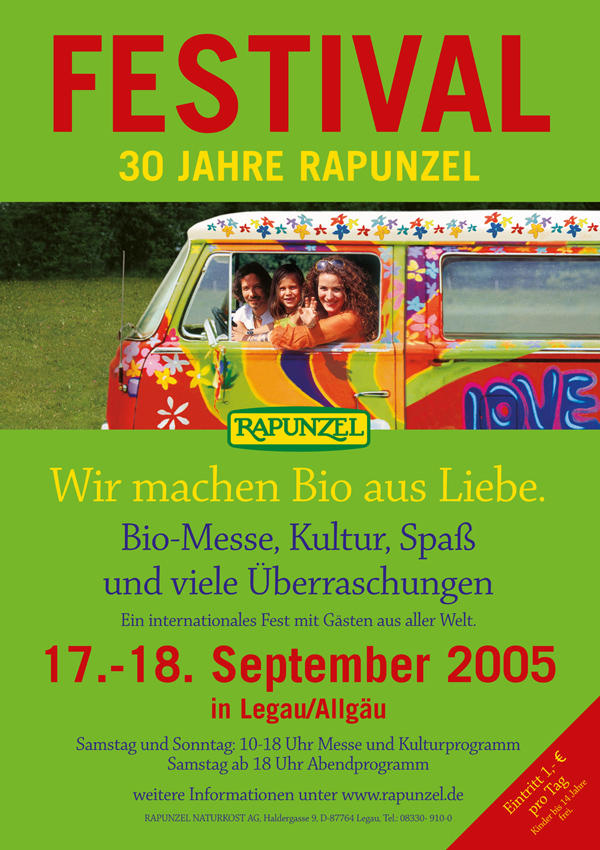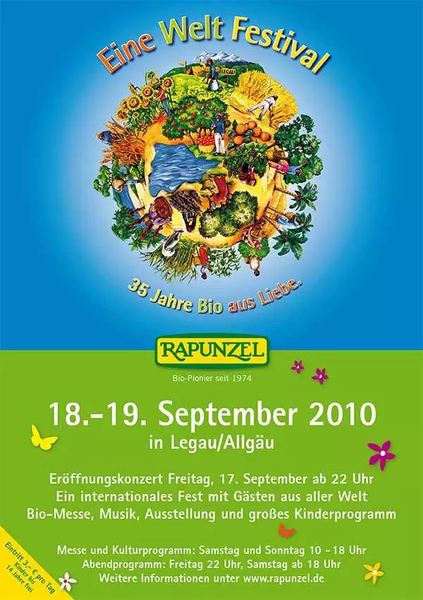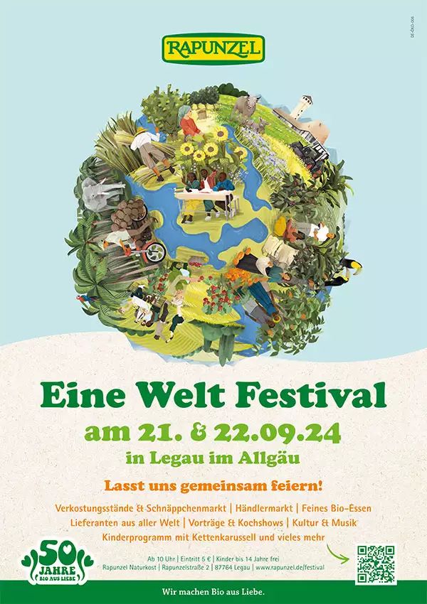 After a long break, the Rapunzel One World Festival is taking place for the 14th time this year! We have something special to celebrate: In September, Rapunzel rings in its 50th anniversary. On 21 & 22 September, we will celebrate with you at the company premises in Legau/Allgäu, with a colourful festival where there is a great deal to experience and discover. Come and visit us and celebrate with us.