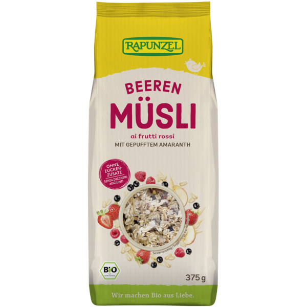 Berry muesli delight with fruity strawberries, raspberries and black currants. Refined with amaranth and genuine Bourbon vanilla. A perfect summer breakfast! With no added sugar (Contains naturally occurring sugars).