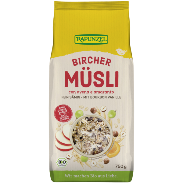traditionally creamy texture according to Dr. Bircher, refined with amaranth, produced in-house by Rapunzel