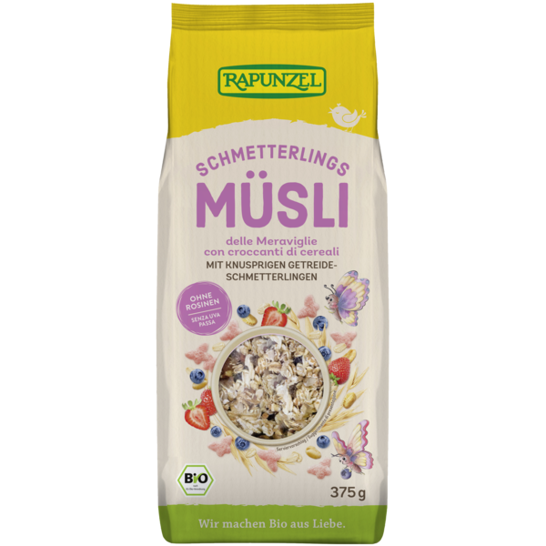 The muesli that gives you butterflies in your stomach The crispy, fruity breakfast fun ? not just for children! Crispy, light pink cereal butterflies, fruity blueberries, strawberries and wholemeal flakes make for a delicious morning treat.