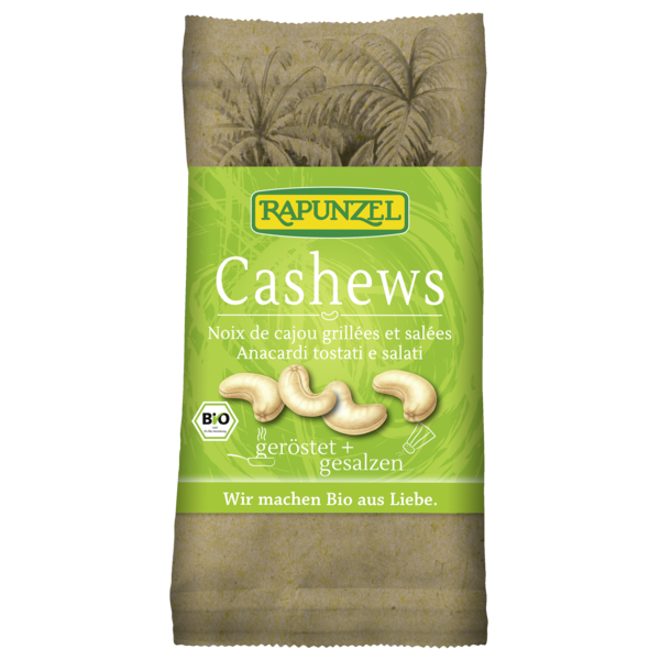 Crunchy snack! Roasted, salted and freshly packed at Rapunzel! Gently roasting with hot air produced with renewable energy unfolds the full cashew nut aroma and gives a perfect crunch.