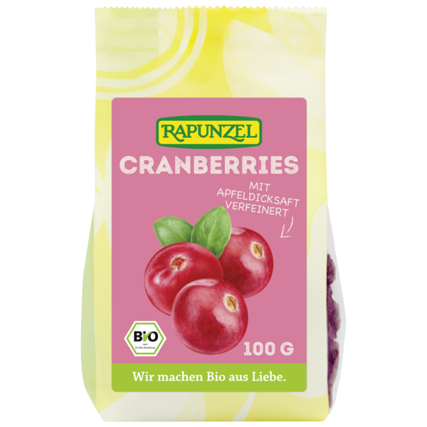 Rapunzel cranberries are cultivated in traditional growing areas in Canada. They are cooked with apple syrup in order to reduce their acidity while pronouncing their pleasantly fruity, slightly tart flavor. The whole cranberries are juicy.