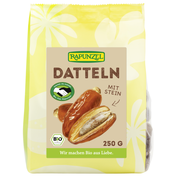 Dates of the variety 'Deglet Nour' are cherished as the queen of dates. The golden to amber-colored fruit have a particularly juicy, firm fruit pulp. They have a unique sweetness with a pleasant honey and caramel flavor. The dates are produced according to fair trade criteria and are cultivated by our HAND IN HAND partner in Tunisia. The sweet, aromatic fruits are pure indulgence.
