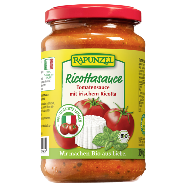 Tasty, savory tomato sauce - refined with fresh ricotta cheese. Thanks to the delicate cheese flavor, the sauce complements the Mediterranean gourmet cuisine. Perfect for a quick Italian gourmet meal. The tomatoes used for this tomato sauce are cultivated 100% in Italy. Rapunzel supports the breeding and preservation of seed-fast organic seeds, e.g. the tomato variety 'Mauro Rosso'.