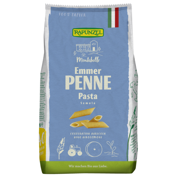 Emmer, also popularly known as summer spelt, is one of the original cereals. The Italian emmer for Rapunzel pasta is sown in November and harvested in July. It is protected from harmful environmental influences and fungal attack by its hard husk. Emmer pasta has a slightly darker, more yellowish colour. It tastes slightly nutty and is more aromatic than the classic durum wheat pasta. In terms of cooking properties, both varieties are comparable.