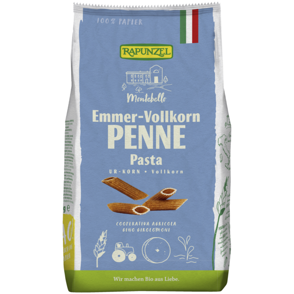 Rapunzel Pasta Speciale is made with Italian whole grain emmer semolina and pure spring water according to an old Italian tradition. Contains 90% of the grain and 100% of the seedling. After the noodles have been pressed into shape, they are dried slowly and gently for 24 hours at a maximum temperature of 60°C.