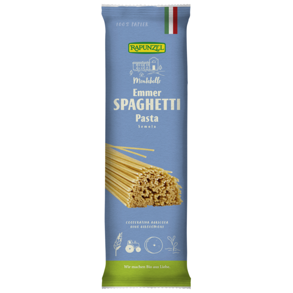 Rapunzel Pasta Speciale is made with fine Italian emmer semolina and pure spring water according to an old Italian tradition. Pasta Speciale contains 65% of the grain. After the noodles have been pressed into shape, they are dried slowly and gently for 24 hours at a maximum temperature of 60°C.