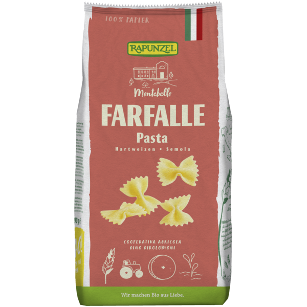 Farfalle - the attractive, butterfly-shaped noodle. Our Italian pastificio follows an Italian tradition and uses only the best Italian durum wheat semolina and pure spring water for the preparation of Rapunzel pasta. A slow and gentle drying process at low temperatures ensures the typical flavor and the perfect 'al dente' bite.