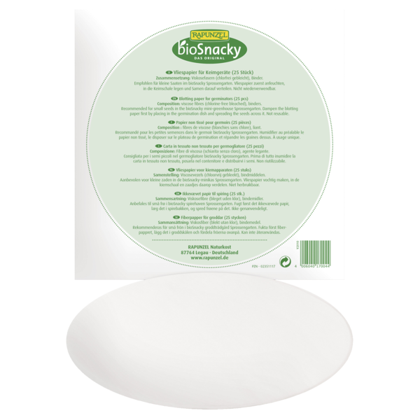 The fleece paper is intended for germinating small seeds in the bioSnacky Sprout Garden. First moisten the fleece paper, place it in the sprouting tray of the sprouting garden and spread the seeds evenly on it. The watering of the sprout garden can then be done comfortably, as usual via the lid, without small seeds getting into the next sprouting tray or clogging up the sprout garden. One pack contains 25 pieces. The fleece paper is not reusable.