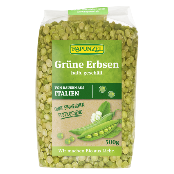 The mature peas are harvested by removing the pods. Next, the peas are peeled, halved and packed.