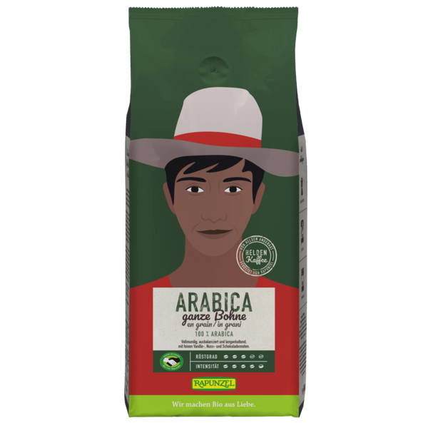 Most of Rapunzel's coffees are pure Arabica coffees. The Arabica bean is a fine, mild highland bean from coffee gardens in Honduras and Peru. We source the beans from fair-trade from our long-standing HAND IN HAND partners. Coffee farmers cultivate coffee plants there according to ecological guidelines. The fair minimum price paid by Rapunzel and the long-term supply relationships enable the coffee producers to secure their livelihoods. The Heldenkaffee Viva and Heldenkaffee Espresso varieties are blends of the fine Arabica beans and the somewhat stronger Robusta beans from Tanzania. We also source the Robusta beans from fair-trade HAND IN HAND partners. Robusta gives the coffee the slightly earthier and stronger taste for which our espresso with original Italian roast and our Heldenkaffee Viva are so appreciated.