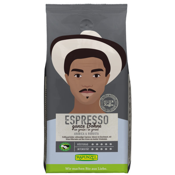 HERO COFFEE from Honduras, Peru and Tanzania - fair trade organic coffee from our Rapunzel HAND IN HAND partners. Arabica & Robusta. Strongly roasted, full-bodied espresso. Intense taste, with fine bitter notes and the aroma of dark chocolate. Our hero coffee was named hero coffee because it is produced by real heroes. Our heroes are the coffee farmers who create flourishing biodiversity om their farms. The cultivation of coffee in mixed culture and underneath shade trees results in stable and biodiverse ecosystems and an extraordinary high quality of coffee beans. The farmers' intense care of the coffee bushes, their thorough manual labor and their careful selection of the beans creates the finest organic and 100 % fair-trade coffee enjoyment - grown by real coffee heroes.