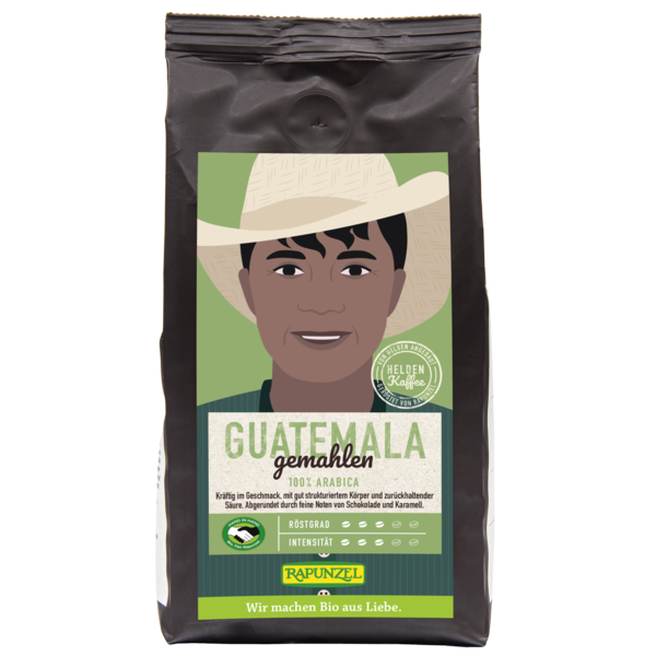 HERO COFFEE from Guatemala 100% Arabica A strong flavour with a well-structured body and restrained acidity. Rounded off with fine notes of chocolate and caramel. Our hero coffee was named hero coffee because it is produced by real heroes. Our heroes are the coffee farmers who create flourishing biodiversity om their farms. The cultivation of coffee in mixed culture and underneath shade trees results in stable and biodiverse ecosystems and an extraordinary high quality of coffee beans. The farmers' intense care of the coffee bushes, their thorough manual labor and their careful selection of the beans creates the finest organic and 100 % fair-trade coffee enjoyment - grown by real coffee heroes.