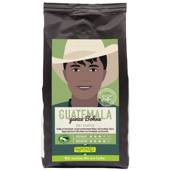 HERO COFFEE from Guatemala 100% Arabica Strong aroma with well-structured flavor and subtle acidity. Refined with fine notes of chocolate and caramel. Our hero coffee was named hero coffee because it is produced by real heroes. Our heroes are the coffee farmers who create flourishing biodiversity om their farms. The cultivation of coffee in mixed culture and underneath shade trees results in stable and biodiverse ecosystems and an extraordinary high quality of coffee beans. The farmers' intense care of the coffee bushes, their thorough manual labor and their careful selection of the beans creates the finest organic and 100 % fair-trade coffee enjoyment - grown by real coffee heroes.
