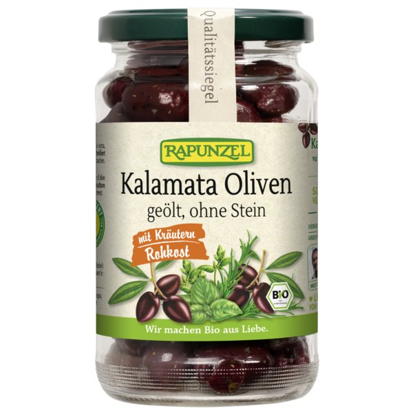 Kalamata' olives are characterized by their aromatic flavor and their multi-colored skin. The olives are cultivated with tender care by small family farms in the sunny mountain regions of the southern Peloponnese in Greece and harvested by hand when fully ripe. Since the olives are processed carefully, they maintain their high-quality raw food quality. The olives are pitted. A light marinade made with best olive oil extra virgin and Mediterranean herbs rounds off the natural olive flavor.