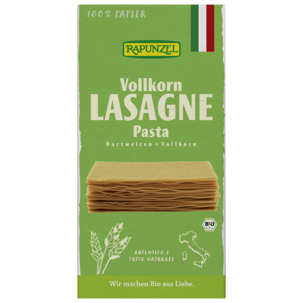 Rapunzel whole grain pasta is made with Italian whole grain durum wheat semolina. Contains 90% of the grain and 100% of the seedling. The dough is shaped into long, thin layers that are cut into plates. Next, the Lasagna plates are slowly and gently dried for 5 hours at a maximum temperature of 75°C.