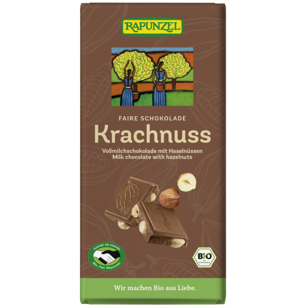Smooth whole milk chocolate with whole, roasted hazelnuts. The aroma of the top-quality, fair trade cocoa is refined by the characteristic, caramel-like flavor of Rapadura whole cane sugar and a dash of genuine Bourbon vanilla, giving this chocolate a special note. In addition to the select raw materials, the conching is the real secret behind a great chocolate. Conching is an art that fully develops the wealth of cocoa-inherent flavors in a step by step process and gives the chocolate its fineness and delicate smoothness.