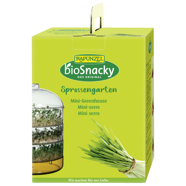 Rinse the greenhouse with cold water and place it in a bright place without direct sunlight. Before germination, rinse the seeds well in a sieve under running water (some seeds need to be soaked previously, see instructions on the packaging). Scatter a thin layer of seeds on the seed tray. For smaller seeds, place beforehand a moistened bioSnacky fleece paper (25 pieces are included) into the seed tray. Water the whole greenhouse through the lid opening. Once the water has flowed through the greenhouse, empty the surplus water tray and fill with a little fresh water, enough to cover the bottom. After harvesting, clean the greenhouse with fruit vinegar and a soft brush or in the dishwasher (max. 65°C). Rinse with clear water and leave to dry.