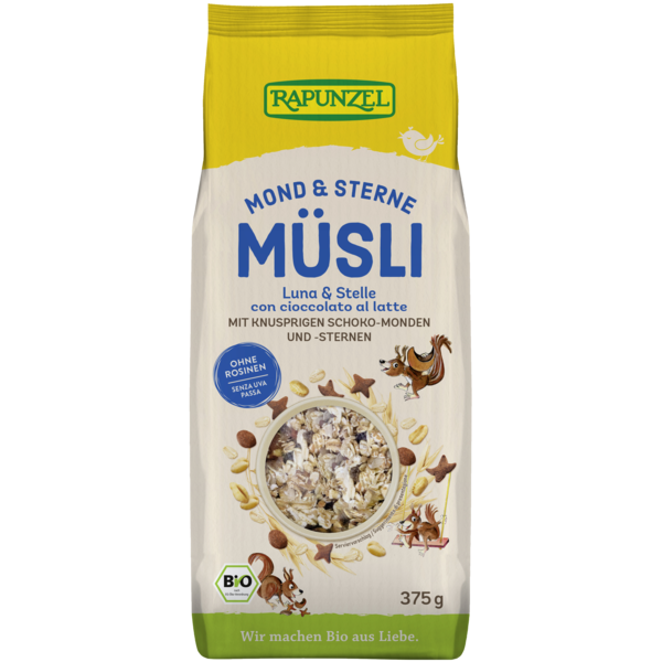 The crunchy chocolate breakfast fun - not only for kids! Crispy chocolate moons & stars, fine chocolate rasps, wholesome cereal flakes, delicious whole grain flakes and poppies. Simply delicious. Start the day with a moment of pleasure!