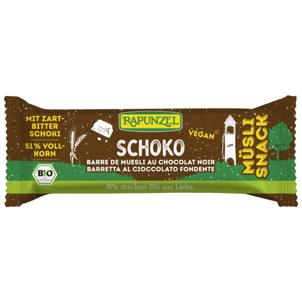 Rapunzel muesli for on the go: This chocolate variety contains whole grain flakes combined with delicious semisweet chocolate and cocoa. Thanks to a balanced combination of rice syrup and maple syrup, the muesli snack bar features a subtle sweetness.