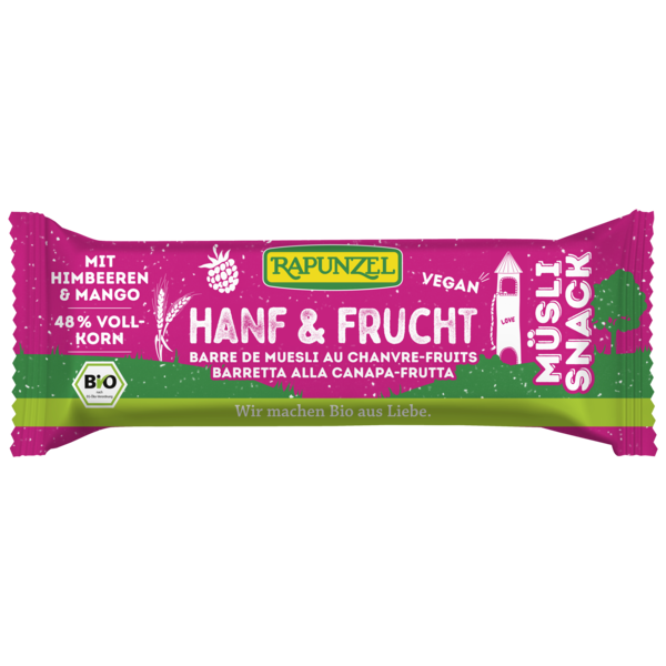 Rapunzel muesli for on the go: those who like it fruity will love the Hemp & Fruit bar with whole grain flakes, delicate, nutty hemp seeds as well as fruity sweet mango pieces and tangy raspberry pieces. Perfect enjoyment is guaranteed. Thanks to a balanced combination of rice syrup and maple syrup, the muesli snack bar features a subtle sweetness.