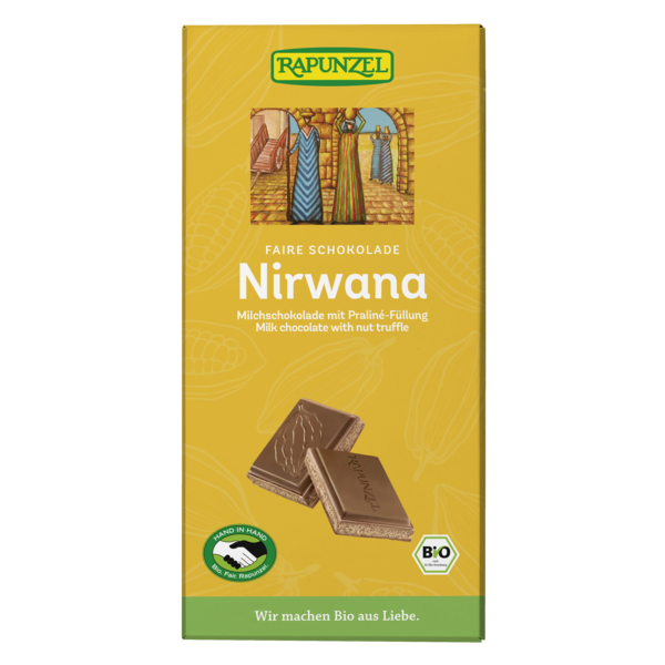 Nirwana - milk chocolate for gourmets. Smooth and creamy with an exquisite, praliné filling. Rapunzel chocolate stands for best Swiss manufacturing tradition and valuable, fair trade ingredients from organic cultivation. In addition to the select raw materials, the conching is the real secret behind a great chocolate. Conching is an art that fully develops the wealth of cocoa-inherent flavors in a step by step process and gives the chocolate its perfect fineness and delicate, incomparable smoothness.