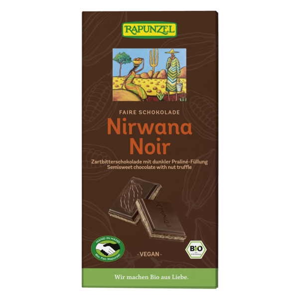 Nirwana noir - the dark chocolate jewel. Smooth and creamy with an exquisite, dark praline filling. Rapunzel chocolate stands for best Swiss manufacturing tradition and valuable, fair trade ingredients from organic cultivation. In addition to the select raw materials, the conching is the real secret behind a great chocolate. Conching is an art that fully develops the wealth of cocoa-inherent flavors in a step by step process and gives the chocolate its perfect fineness and delicate, incomparable smoothness.