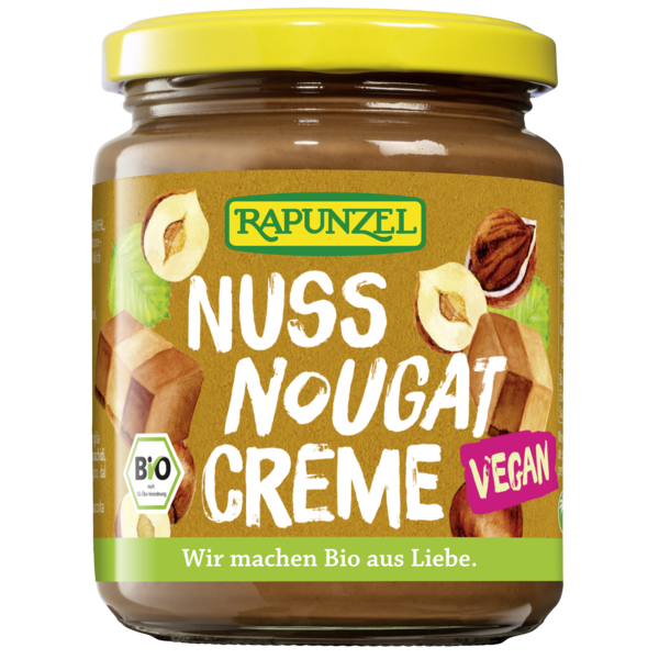 vegan, with 33% freshly roasted hazelnuts, with cane sugar Cristallino, produced in-house by Rapunzel