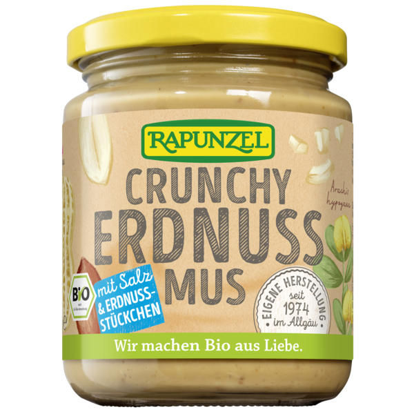 Rapunzel has been producing nut butter since 1974. Roasting the peanuts enhances their full aroma. After being roasted, the nuts are finely ground. Crunchy peanut chunks and a pinch of sea salt refine this recipe. The gentle manufacturing process guarantees you a unique taste!