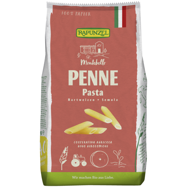 Short, tube-shaped noodles with subtle grooves and beveled ends. Our Italian pastificio follows an Italian tradition and uses only the best Italian durum wheat semolina and pure spring water for the preparation of Rapunzel pasta. A slow and gentle drying process at low temperatures ensures the typical flavor and the perfect 'al dente' bite.