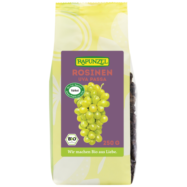 Dried grapes are called raisins, sultanas or currants. They are generally referred to as “raisins”. Rapunzel sultanas and raisins are made from light grapes of the same variety. The only difference is that sultanas are dipped and remain lighter in colour. “Dipping” is the brief immersion of the grapes into a solution of water and potash. Raisins are not dipped and need to dry longer. Currants are small, blue grapes without a seed, which owe their name to the Greek port city of Corinth, in whose region the grape is preferentially grown.