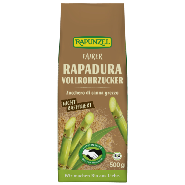 Rapadura whole cane sugar is characterised by slightly caramel-like flavour, a pleasant malt taste and a strong brown colour. Thanks to its special taste, Rapadura is ideal to sweeten desserts, pastries and drinks. Rapadura Whole Cane Sugar is made from pure sugar cane juice. It is produced according to a traditional method and is not refined. This preserves the full molasses content of the sugar cane. Rapadura whole cane sugar comes from our HAND IN HAND programme which combines organic agriculture with fair trade.