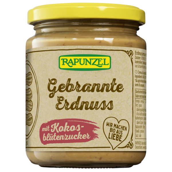 Rapunzel has been producing nut butters in a special process for nearly 50 years. Roasting the peanuts enhances their full aroma. After being roasted, the peanuts are coarsely ground with the coconut palm sugar and the fine spices. The gentle manufacturing process guarantees you a unique taste!