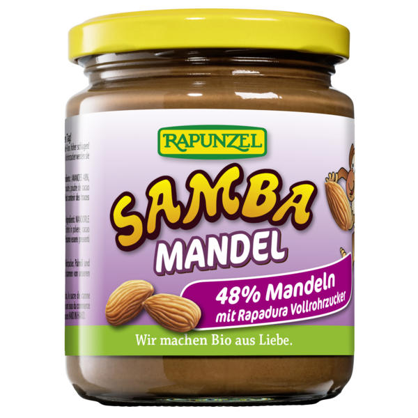 Start the day with Samba! 48% aromatically roasted almonds make the heart of every almond lover beat faster. Almonds, premium cocoa, Allgäu whole milk and valuable Rapadura whole cane sugar are combined and mixed to melt-in-your-mouth Samba. A dash of genuine Bourbon vanilla rounds off the exquisite taste. Cocoa, Rapadura whole cane sugar, Cristallino cane sugar, palm oil and cocoa are fair trade products from Rapunzel HAND IN HAND partners. The consistency depends on the ambient temperature. For a creamy consistency store at room temperature, for a firmer consistency store in the fridge.
