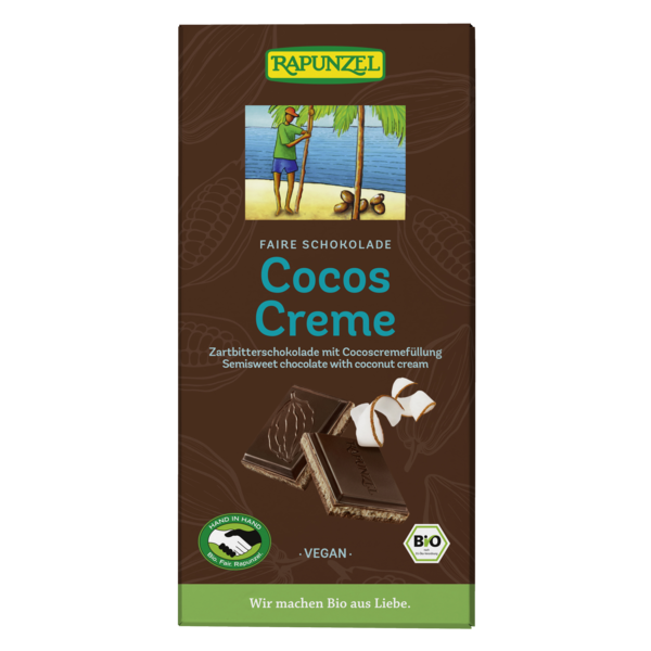 Exquisite semisweet chocolate filled with refreshing, vegan coconut cream. Enjoy refrigerated in the summer as a special treat! Rapunzel chocolate stands for best Swiss manufacturing tradition and valuable, fair trade ingredients from organic cultivation. In addition to the select raw materials, the conching is the real secret behind a great chocolate. Conching is an art that fully develops the wealth of cocoa-inherent flavors in a step by step process and gives the chocolate its fineness and delicate smoothness.