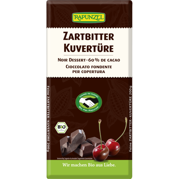 Soft pralines, sweet fruit or delicate pastry would taste only half as good without a cover of soft melting, velvety chocolate glaze. With an extra portion of aromatic, semisweet cocoa and a dash of Bourbon vanilla this chocolate couverture will refine your cakes, pastries or pralines. Made with fair trade cocoa and sugar, it belongs to the Rapunzel HAND IN HAND product range.