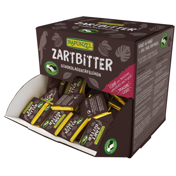 Mini semisweet chocolate bars available in a practical dispenser box! The mini chocolate bars are ideal with coffee or for nibbling in between. The high-quality dispenser box can also be displayed in the bistro area. HAND IN HAND fundraising campaign: Per mini chocolate bar 1 cent will go to the project 'Imagine Light'. Imagine Light is a non-profit solar energy initiative of LOVE FOR LIFE e.V. It provides indigenous peoples in Central and South America with sustainable access to clean and safe renewable energy. This is a basic condition and important catalyst for the self-determined and sustainable development of the indigenous peoples and at the same time protects endangered rainforest areas.
