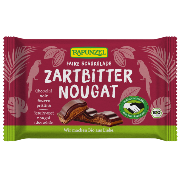 Fine, aromatic dark chocolate with melt-in-the-mouth nougat filling - produced according to fair trade criteria by Rapunzel HAND IN HAND partners. In addition to the select raw materials, the conching is the real secret behind a great chocolate. Conching is an art that fully develops the wealth of cocoa-inherent flavors in a step by step process and gives the chocolate its fineness and delicate, incomparable smoothness.