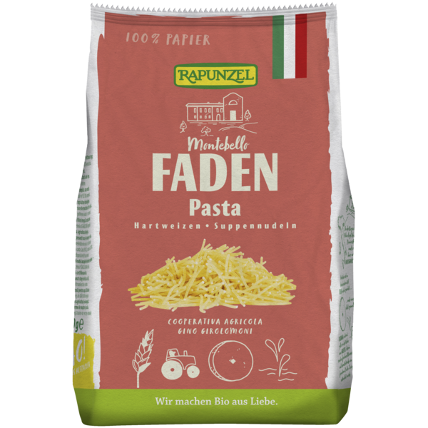 Belongs into every kitchen - the popular and quick-to-prepare soup noodle. Our Italian pastificio follows an Italian tradition and uses only the best Italian whole grain durum wheat semolina and pure spring water for the preparation of Rapunzel pasta. A slow and gentle drying process at low temperatures ensures the typical flavor and the perfect 'al dente' bite.