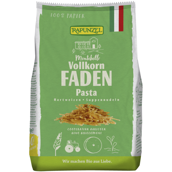 Belongs into every kitchen - the popular and quick-to-prepare soup noodle. Our Italian pastificio follows an Italian tradition and uses only the best Italian whole grain durum wheat semolina and pure spring water for the preparation of Rapunzel pasta. A slow and gentle drying process at low temperatures ensures the typical flavor and the perfect 'al dente' bite.