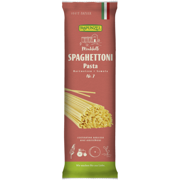 Spaghettoni no. 7 - typical spaghetti shaped noodles with a greater diameter! This pasta emphasizes the taste of different sauces, be it alla 'Aglio e olio' or simply a pure tomato sauce with fresh vegetables. Best Italian durum wheat semolina and pure spring water in combination with a slow and gentle drying process at low temperatures ensure the typical flavor and the perfect 'al dente' bite.