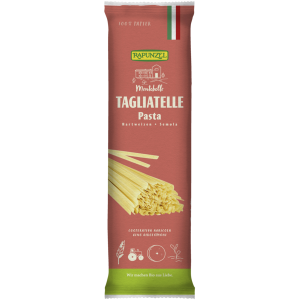 Tagliatelle - popular, long noodles. Our Italian pastificio follows an Italian tradition and uses only the best Italian durum wheat semolina and pure spring water for the preparation of Rapunzel pasta. A slow and gentle drying process at low temperatures ensures the typical flavor and the perfect 'al dente' bite.